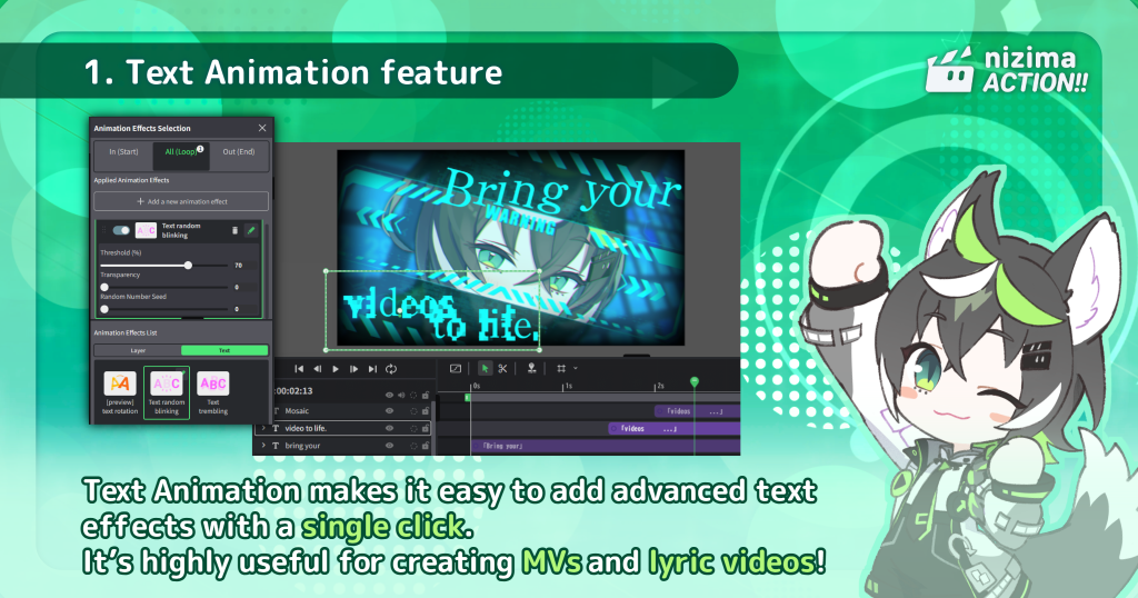 Create MV-Style texts with Text Animation Feature! Major Update for nizima ACTION!! [0.44.0]