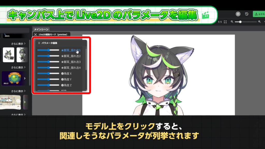 Live2Dモデルをダブルクリック→動かしたい付近をクリックして、パラメータを編集できるようになりました🙌